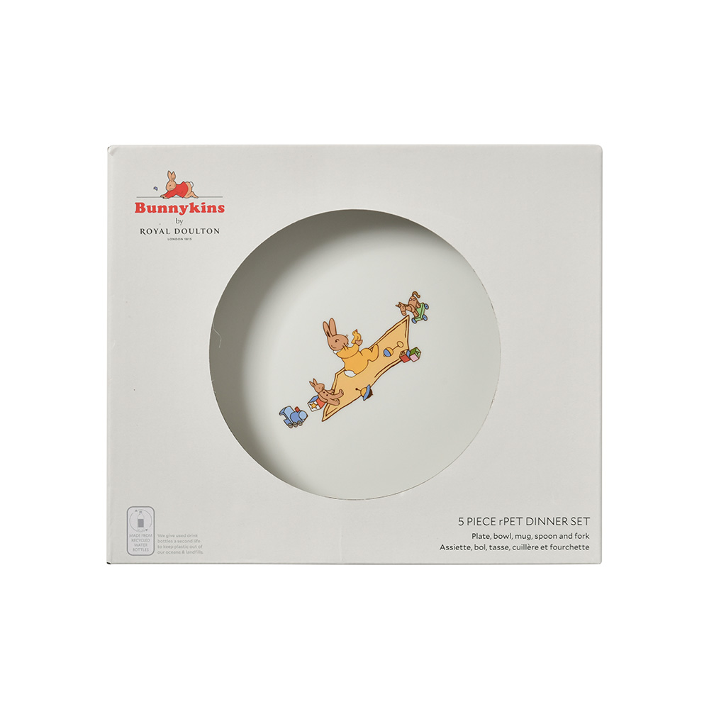 Crafted from sturdy and durable BPA free recycled PET, this Bunnykins 5 Piece Dinner Set is built to last